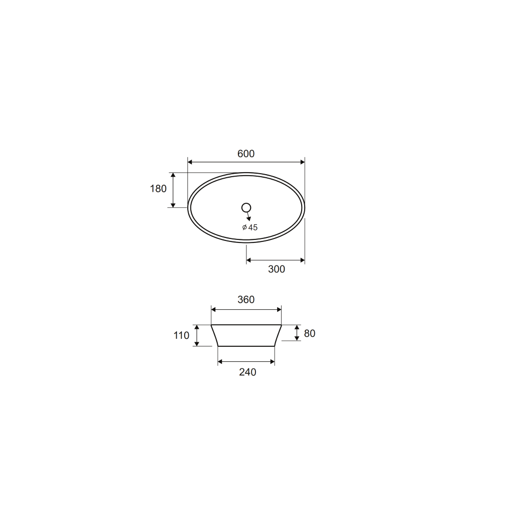 Lavabo da appoggio, 600x360x110mm.